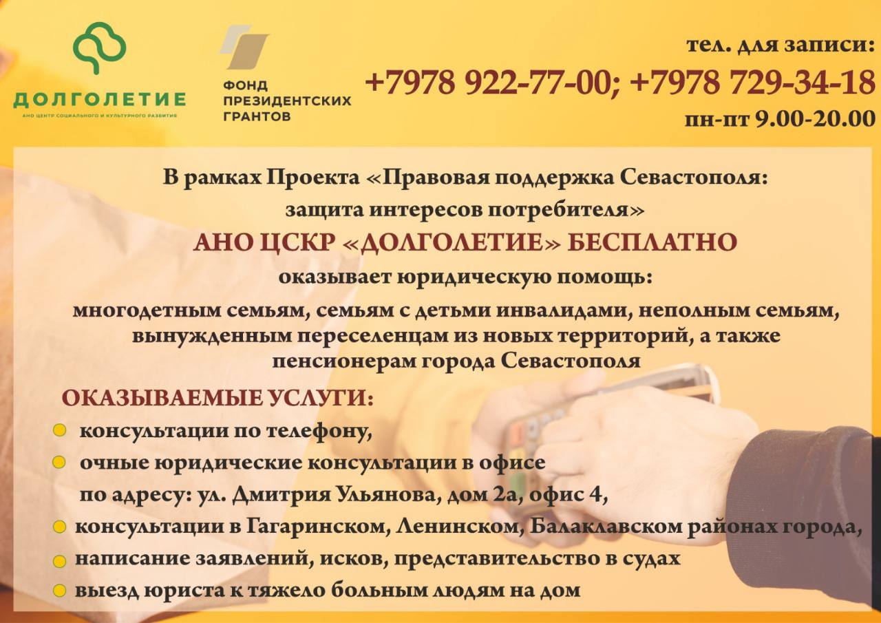 Наши партнеры – АНО ЦСКР «ДОЛГОЛЕТИЕ» – реализуют важный проект «Правовая Поддержка Севастополя: Защитим Ваши Права Вместе» при поддержке Фонда президентских грантов.